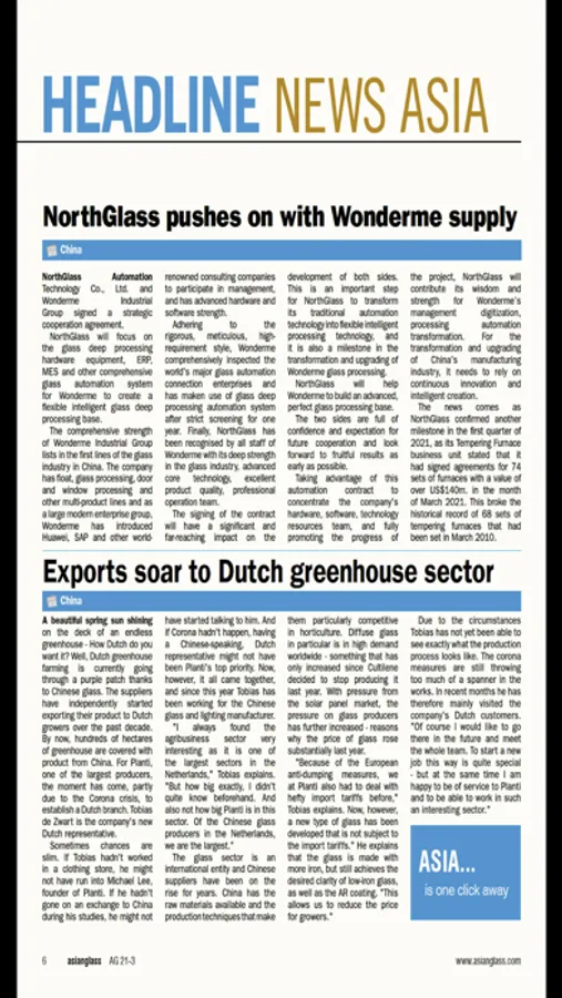 Asian Glass magazine is the leading industry title for the world’s glass industry professionals. With a dedicated focus into market trends, supply and demand and technological developments across all of Asia, the Asian Glass App ensures you are kept fully up to date with the information you need to make strategic decisions with regards to your glass business. Covering the entire continent, from Turkey to China, Asian Glass supplies “must have” market research on a bi-monthly basis, as well as news, views and industry interviews with key leading personnel in Asia’s – and the world’s – glass industries. Whatever your location, the glass manufacturing industries of the Asian continent are having a direct influence on your local and regional industry. Make sure you don’t miss the opportunities that this exciting sector presents, or are caught unawares by the challenges it causes. Download the Asian Glass App and keep yourself informed and at the cutting edge.