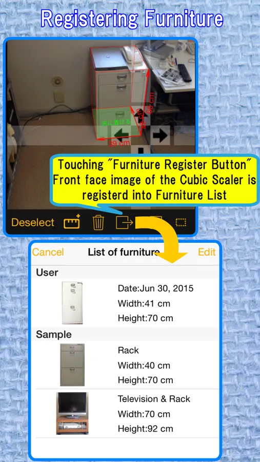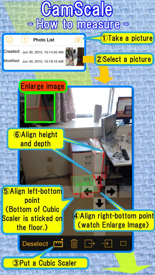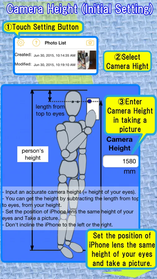 The "CamScale" uses an accurate camera height for calculating an accurate dimension of furniture. So please input an accurate camera height in this settings and keep this height when you take a photo in the "CamScale".