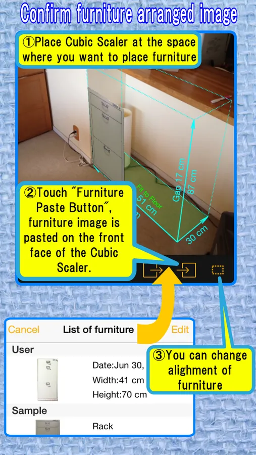 Same as (2), please put "Cubic Scaler" at the space where you want to place furniture.