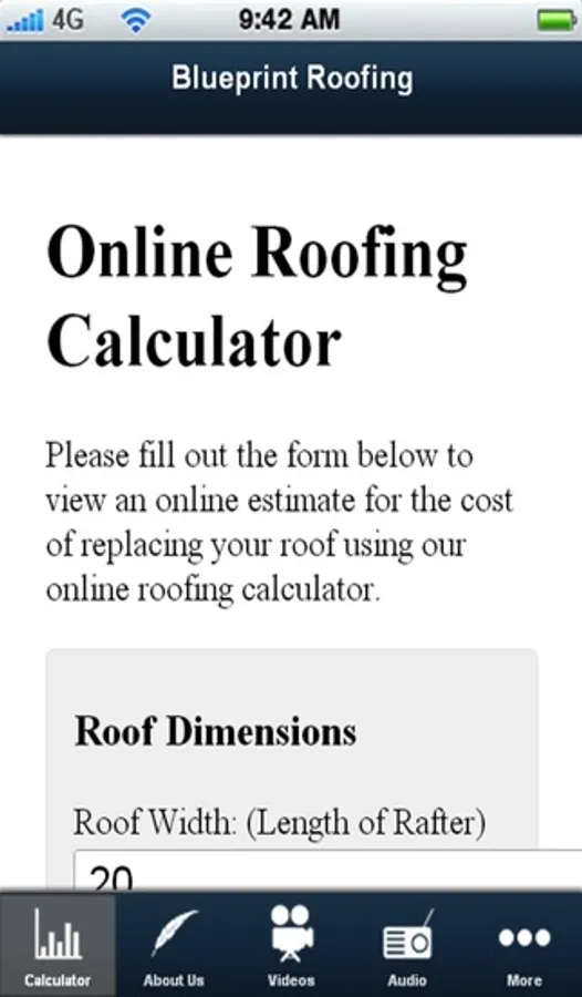 Roofing Business Blueprint Calculator to help roofing contractors with quick pricing and getting a fast quote of what some roofing contractors are charging for new roof replacement. This app has pricing for both asphalt and metal roofing cost of per 100 square foot pricing and offers width times length calculations.