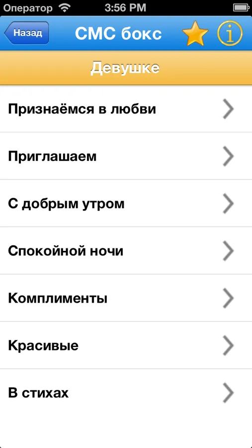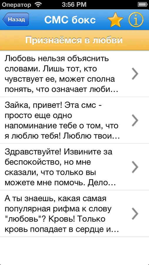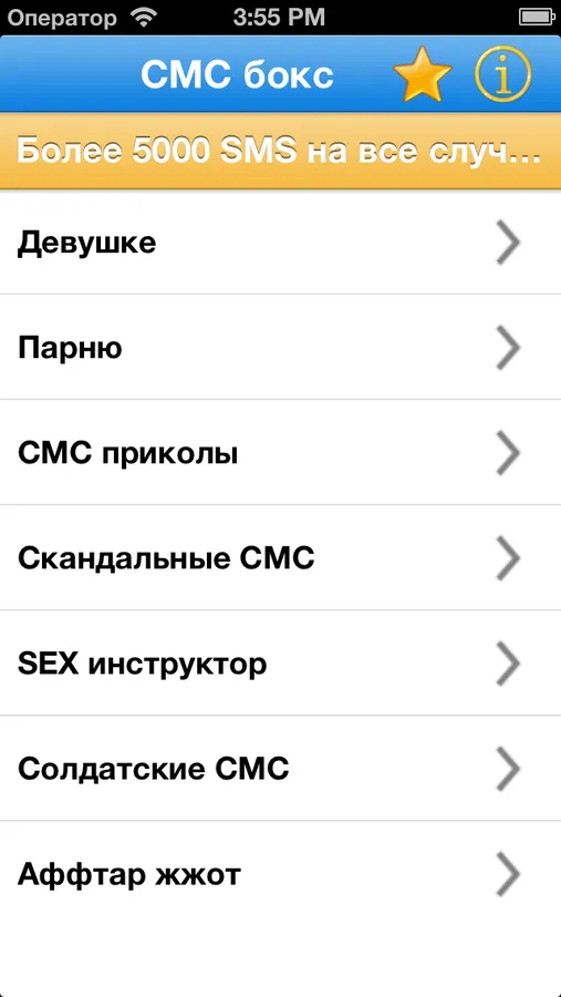 Теперь Вам не надо искать смс, копировать смс или запоминать текст смс-ки, теперь у Вас есть все эти смс в одном приложении! Приложение содержит более 100 категори и более 5000 на все случаи жизни. Делитесь друг с другом мыслями и эмоциями!