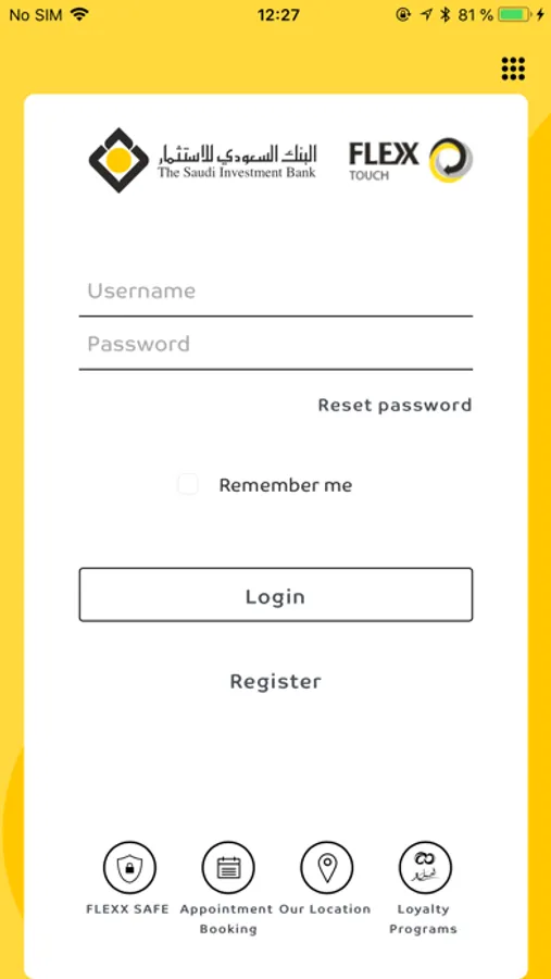 - الدخول لخدمة الانترنت البنكيه نسخة الأجهزة الذكية (فلكس تاتش) اينما كنت: الدخول لهذه الخدمة يكون عبر إستخدام اسم المستخدم و كلمة المرور الخاصة بخدمة الانترنت البنكية. بامكانك تنفيذ جميع العمليات البنكيه فوراً. و في حال لم تكن مسجلا بامكانك اتباع الخطوات الموضحة بعد الضغط على أيقونة الدخول.