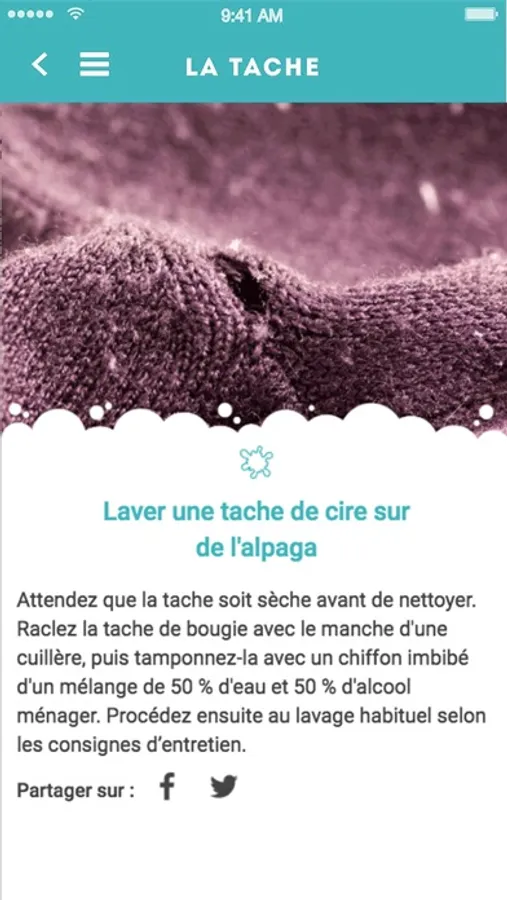 Mon Etiquette vient aussi à votre secours pour vous aider à enlever toutes les tâches, même les plus tenaces : renseignez l’origine de la tache, la matière de votre textile et on vous transmet la solution d’entretien !
