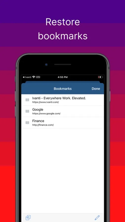 Ivanti Web@Work allows you to easily and securely access your organization's web content on your iPad, iPhone, or iPod touch. Web@Work works with your organization's Ivanti infrastructure to provide access to internal web content without a separate VPN connection, view bookmarks based on your role, and ensure that all sensitive data is secured.