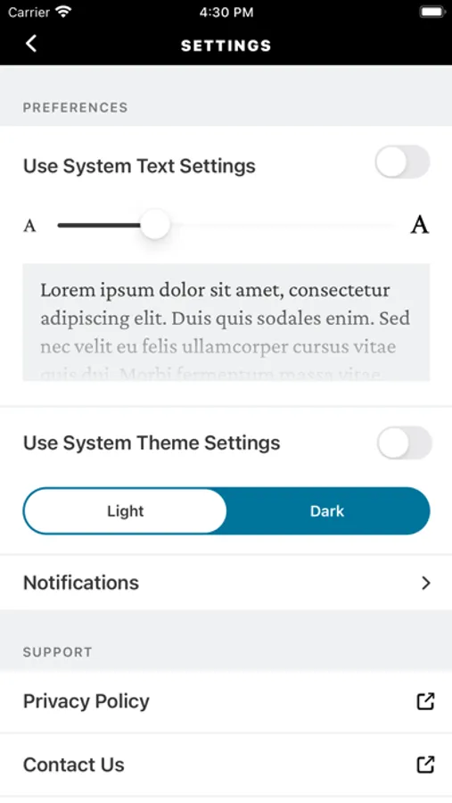 - Experience enhanced accessibility options including dark mode, adjustable text size and screen reader support.