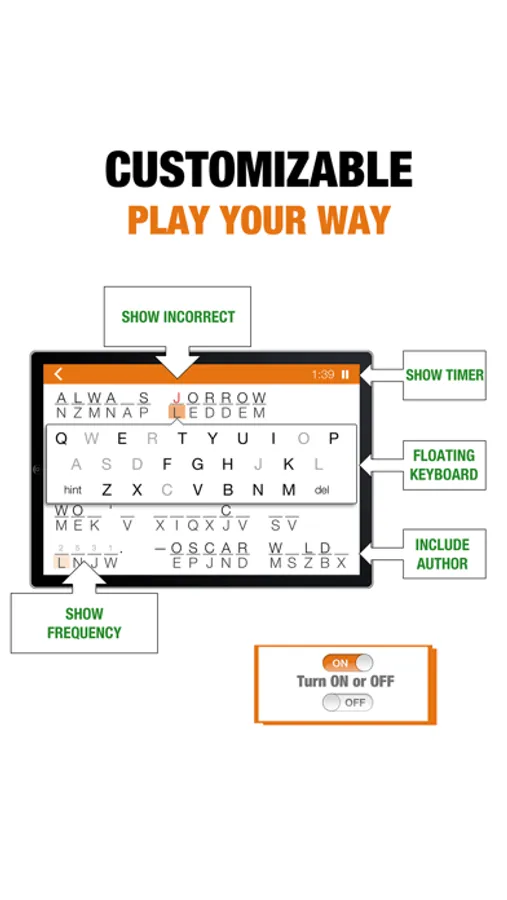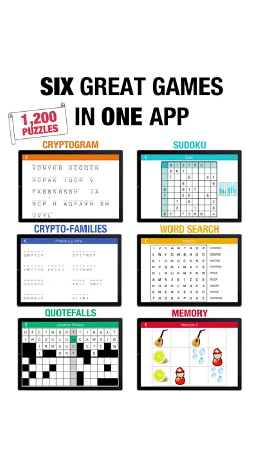 Six great games all in one app. Your one stop puzzle app. It's like always having a puzzle magazine with you - play for minutes or for hours. The puzzles are witty and clever - give it a try!