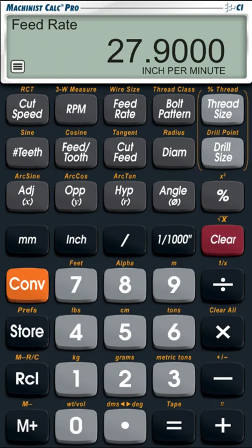 • Speeds and Feeds - Calculate for Milling, Turning and Drilling; Spindle Speed (RPM), Feed Rate (IPM), Cut Speed, Cut Feed, Feed per Tooth, Number of Teeth and Radial Chip Thinning adjustment factor