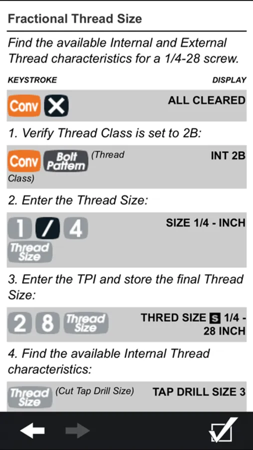 • Thread Size - Enter numeric, fractional or metric thread sizes and display tap, roll tap, close and free fit drill sizes. Display pitch, major and minor diameters