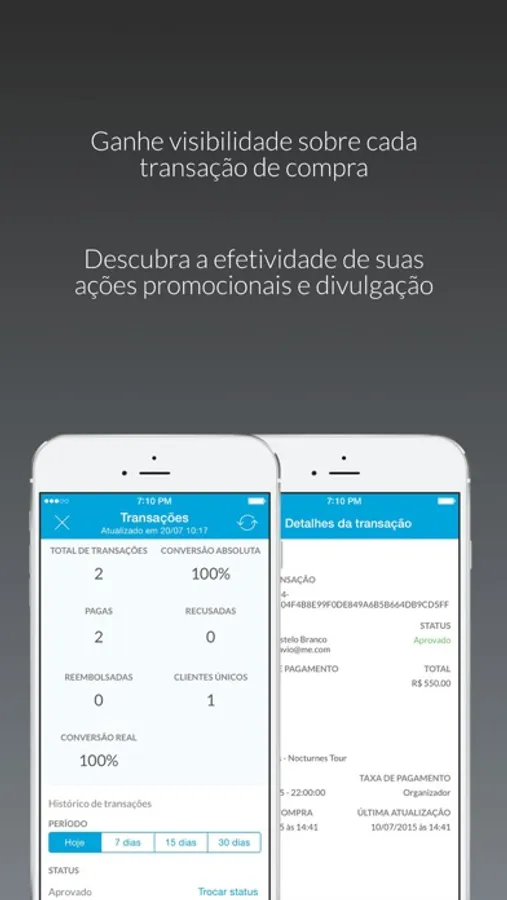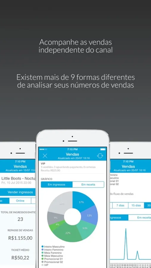 O Backstage agrega todas as informações de vendas em um só lugar, dando aos produtores de eventos informações sobre cada venda, tais como total de ingressos vendidos, ticket médio, transações pagas e conversão. Tudo isso a qualquer momento.
