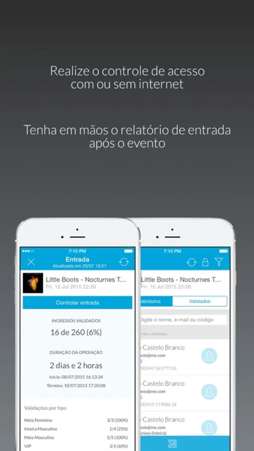 A primeira impressão é a que fica, e é por isso que a recepção é uma parte crítica de qualquer evento. O controle de entrada do Backstage permite aos produtores utilizarem o aplicativo, mesmo sem conexão à Internet, para validar os ingressos de seus clientes utilizando um leitor de QR Code ou procurando pelo nome na lista de ingressos. Nosso aplicativo consegue validar os QR Codes em menos de 1 segundo, com segurança e praticidade. Ele já foi utilizado em eventos com mais de 4000 pessoas.