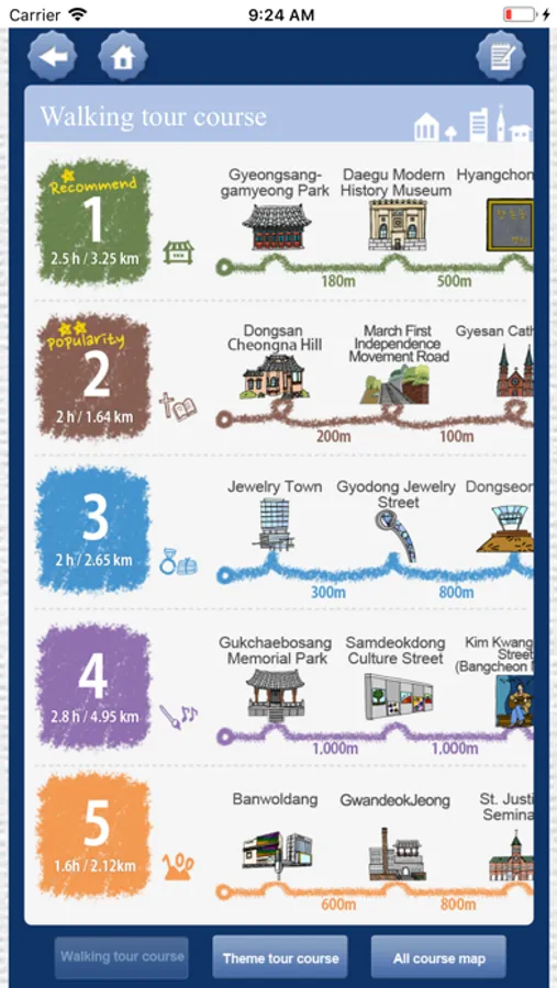 DaeguJunggu’s Walking Tour was selected as one of the “ninety-nine must-visit tourist attractions for Koreans” and “2012 Korean Tourism awards”. This application program provides detailed information about DaeguJunggu’s Walking tour courses (Course 1: Gyeongsang-ga-myeongDalseong road, Course 2: Modern Culture Alley, Course 3: Fashion and Oriental Medicine Road, Course 4: SamdeokBongsan Culture Road and Course 5: Namsan 100th year History Road) as well as the themed tour courses. It also provides a way-finding program and neighborhood search function, as well as allowing you to record your memories of the tour.