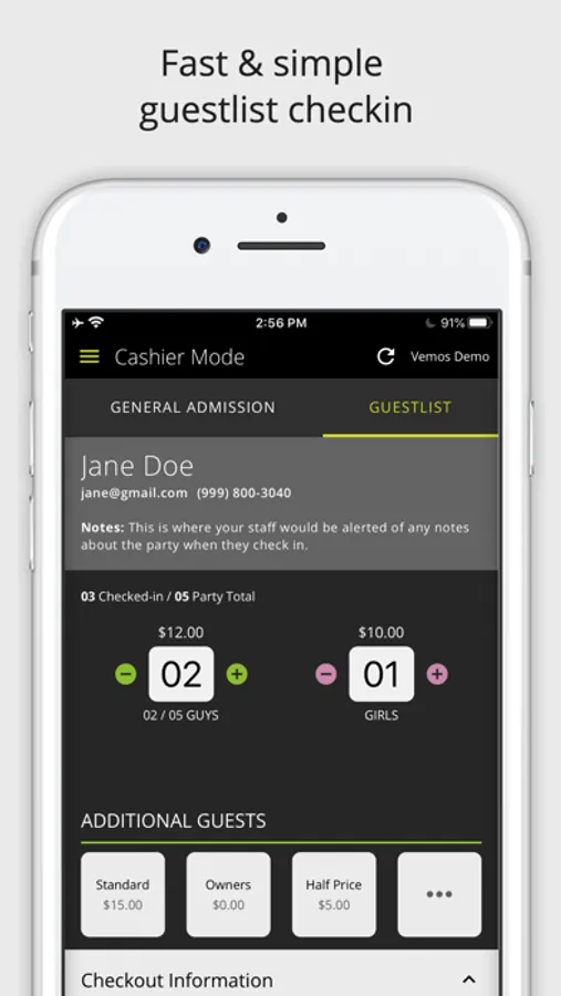 Your door will never run smoother. Easily toggle between Reservations, General Admission and Gueslist screens to accommodate every guest. You can even accept payment for both a guestlist party and walk-up guests in the same transaction.