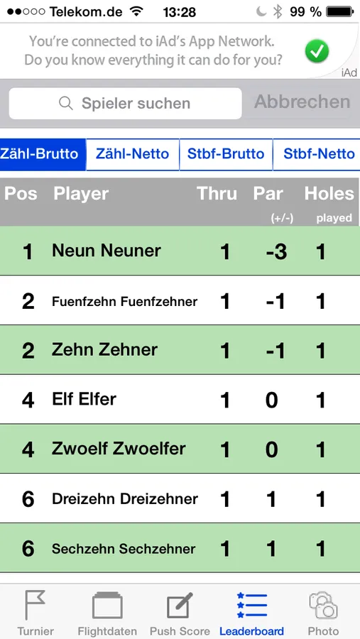 Follow the tournament live on your iPhone or the web. Observe the current leaderboard and see the score cards of the players.