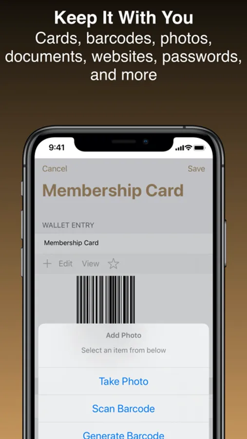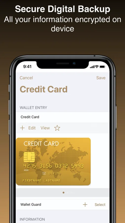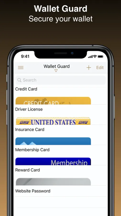Wallet Guard allows you to securely store the contents of your wallet right on your phone. Manage your passwords, and keep your information secure.
