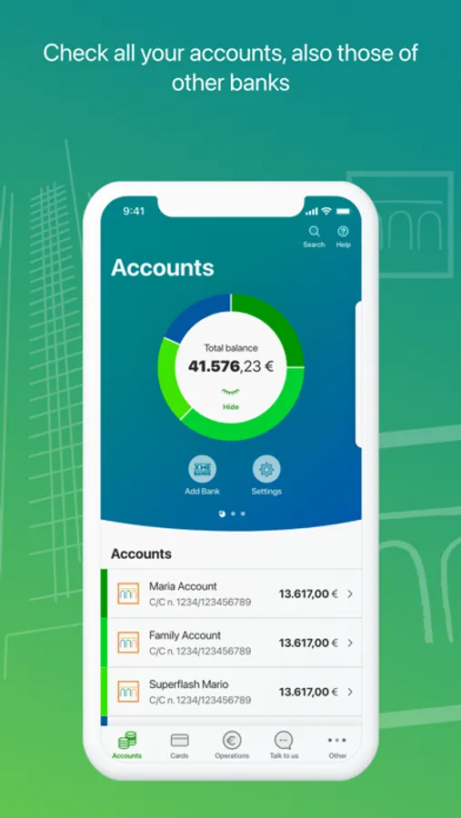 • Aggregate in one single view all your accounts and cards, even of other banks, with XME Banks