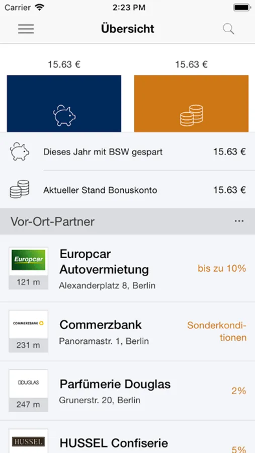 In unserer App sehen Sie die Partnerfirmen mit BSW-Vorteil in Ihrer Nähe übersichtlich in einer Liste oder auf einer Karte. Dank der Navigationsfunktion finden Sie den BSW-Partner schnell und unkompliziert. Dank der Benachrichtigungsfunktion vergessen Sie auch Ihre BSW-Karte vor Ort nicht mehr und können sich über neue Aktionen Ihrer Lieblings-Partnerfirmen benachrichtigen lassen.