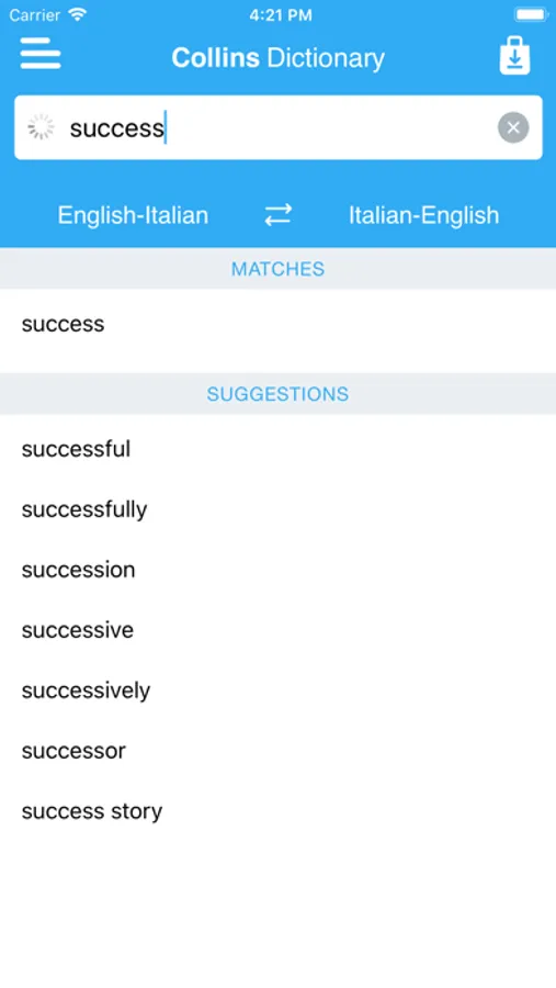• Search autocomplete helps you find words quickly by displaying predictions as you type.