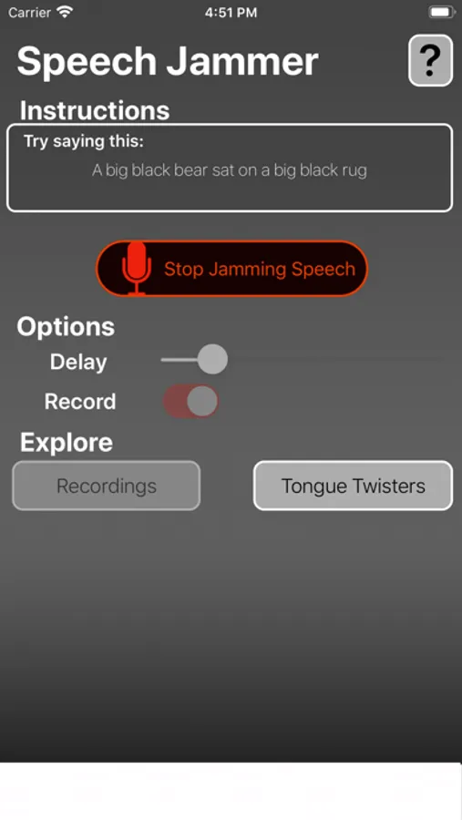 Speech Jammer echos your voice back using an adjustable delay, making it very difficult (or impossible) to talk. The more you spontaneously and continuously talk with the Speech Jammer, the harder talking becomes. This is known as Delayed Auditory Feedback or DAF.