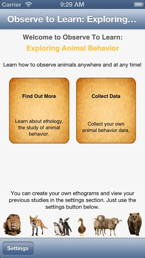 Most importantly, the app allows YOU to be the researcher of any animal you choose. You can use the default ethogram (behavior checklist) to observe any animal or you can launch a study of your own design by creating an original ethogram where YOU define the behaviors. Either way, you’ll end with real data that you can share with your friends, parents or teachers. You can even collect data over time for a long-term class project.