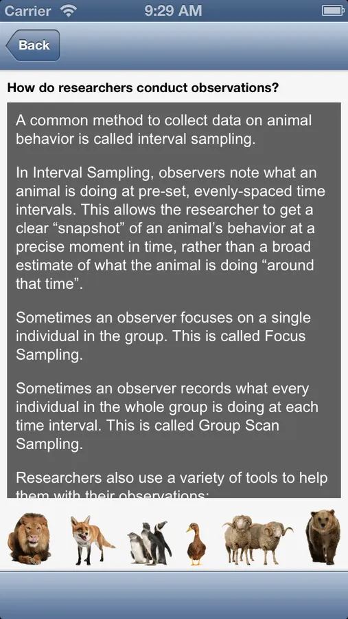 Have you ever wondered what it might be like to be a researcher like Jane Goodall? This app lets you step into the shoes of an animal behavior scientist by conducting your own investigation! Use this app to study your favorite animals, anywhere, anytime-- at your local zoo, park, backyard, or even in your living room observing a family pet.
