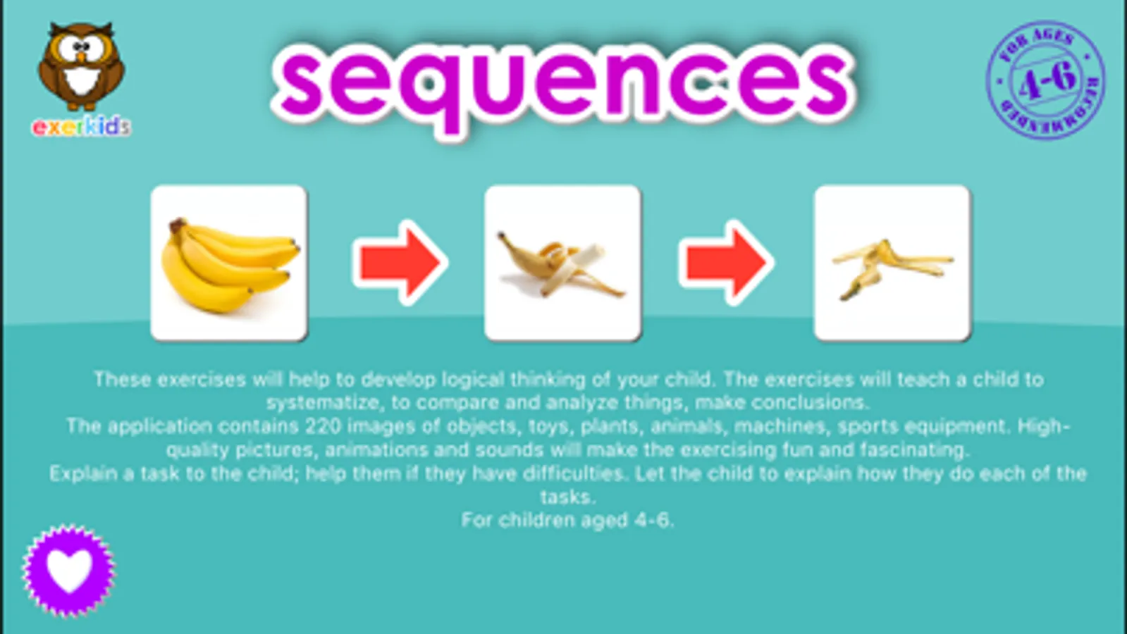 The application contains 220 images of objects, toys, plants, animals, machines, sports equipment. High-quality pictures, animations and sounds will make the exercising fun and fascinating.