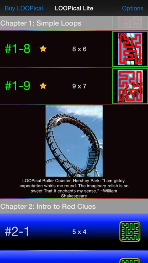 ENJOY the 27 puzzles in LOOPical Lite. Then give yourself a treat - buy LOOPical for hours and hours of fun. LOOPical includes 108 all new beautiful puzzles ranging from very small to very large and from super easy to super hard. Test your LOOPicality!