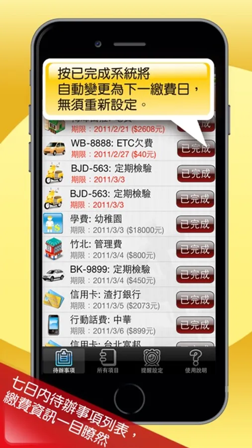 是 每月需支付許多遲繳費,令人沮喪!曾經嘗試各種不同提醒工具或calendar, 但因設定項目不是針對繳費, 因此總有不完美之處。於是動手規劃一款符合台灣環境的繳款提醒軟體,希望只要簡單設定即可自動提醒所有項目, 也有很多個人化功能與設定, 目標是「準時繳款」!同事說這是一款「罰款防火牆」相信使用它將可輕鬆搞定繳款事, 不再為稅費及遲繳而煩惱!