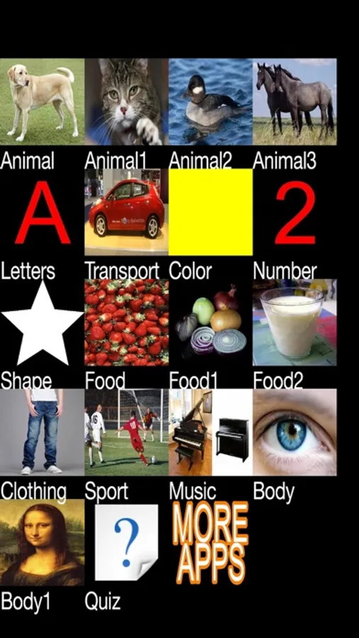 11 Categories: include Food, Animals, Alphabet, Transportation, Numbers, Colors , Shapes, Clothing, Sports , Body, Music Instruments.