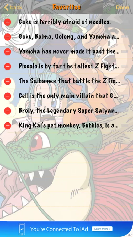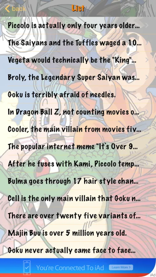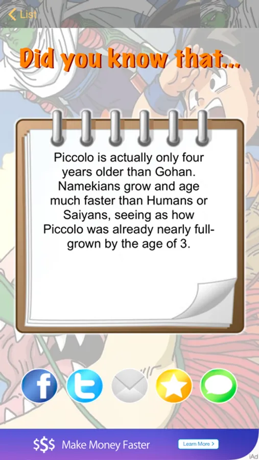 If you are a Dragon Ball fan – this app is perfect for you! You fill find here many interesting facts from all Dragon Ball series, for example did you know that Piccolo is actually only four years older than Gohan. Namekians grow and age much faster than Humans or Saiyans, seeing as how Piccolo was already nearly full-grown by the age of 3. Or did youn know that Vegeta almost always addresses Goku by his Saiyan birth name, "Kakarot", but has on rare occasions addressed him as "Goku". Vegeta says the name "Goku" only eight times. You'll find out much more from this app so don't wait, just get it!