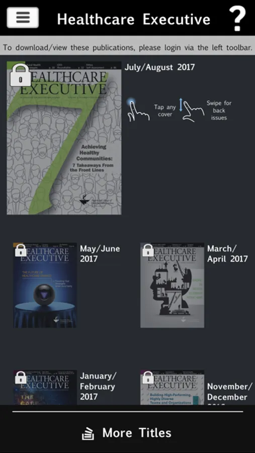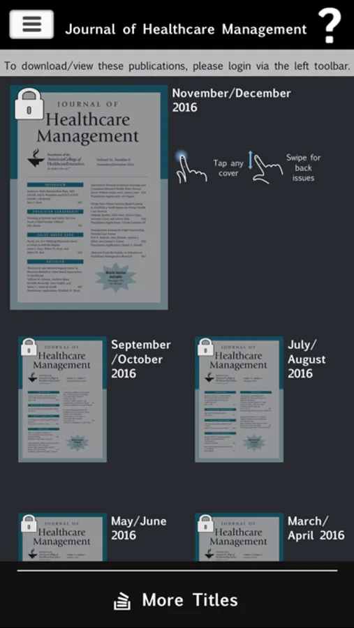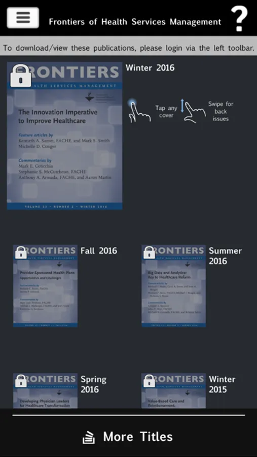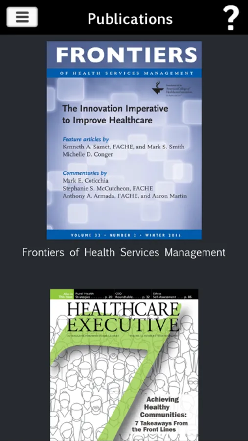 The American College of Healthcare Executives Publications App is designed to provide an enhanced online experience for readers of Healthcare Executive magazine, the Journal of Healthcare Management and Frontiers of Health Services Management. The app is intended for use by ACHE members and publication subscribers only; log-in will be required after download.