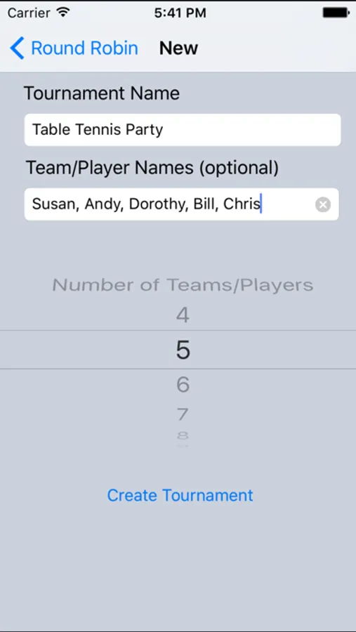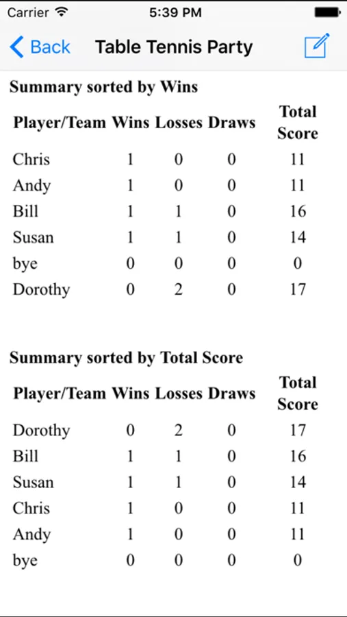 Generate Round Robin Tournament Schedules based on the number of teams/players. Wins, losses, and draws can be recorded. The resulting schedule and results can be emailed. Tournaments are automatically saved and can be deleted with a swipe.
