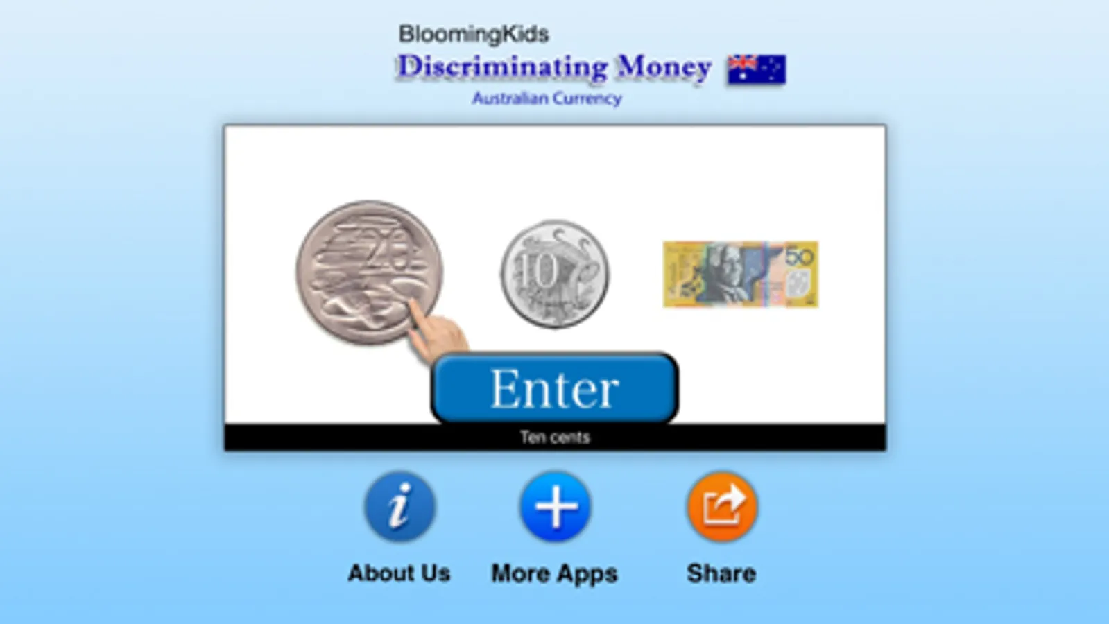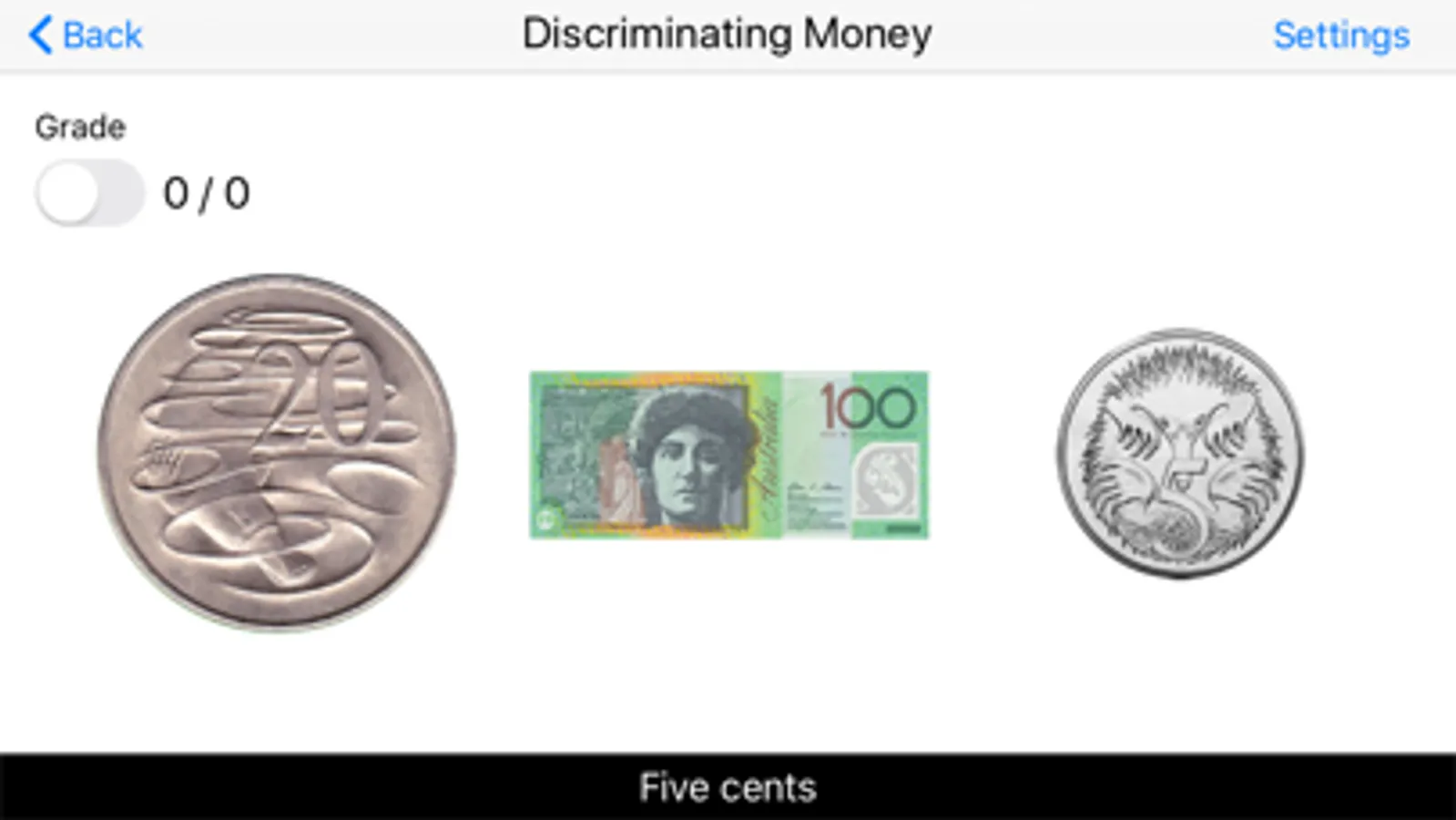 Discriminating Money for Australian Currency - A coin or note appears at top of the screen. The program voice names it. The student chooses it from one, two, or three items on the screen.This teaching program aimed at autistic, learning disabled, and young mainstream children.