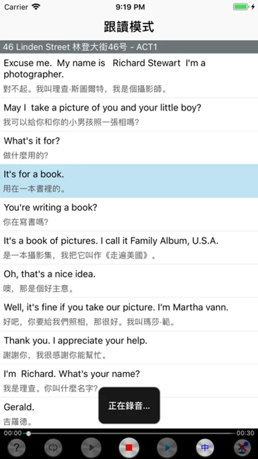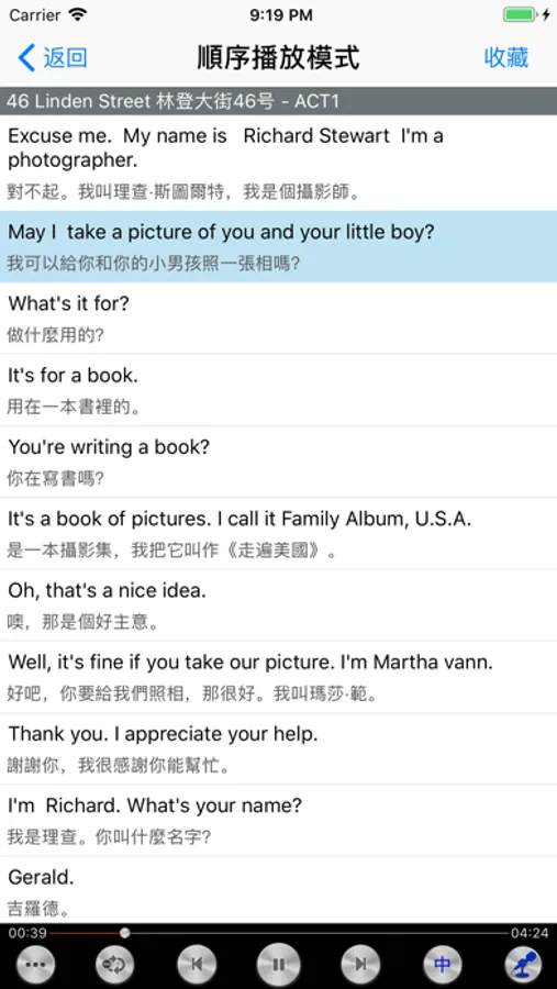 本APP每课都配有详细的中文字幕,并配以强大的可跟读复读的播放器,单词即按即查(联想记忆、常用词组、同义词辨析等),课文内容轻松点读、口语跟读练习、支持后台播放、多种播放学习模式!