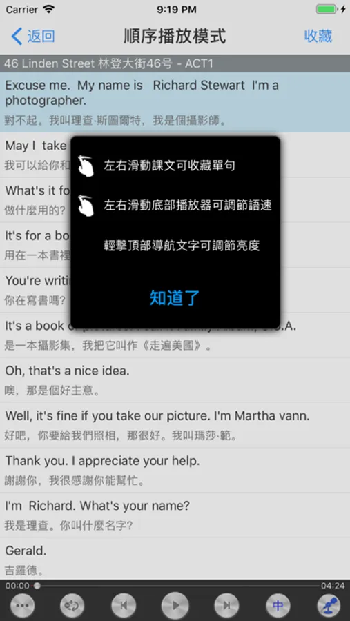 3、多种播放模式选择:单句循环、单课循环、课程连播、对比播放、是否显示中文译文播放等等,适合各种学习模式,能帮你迅速提升英文听力能力