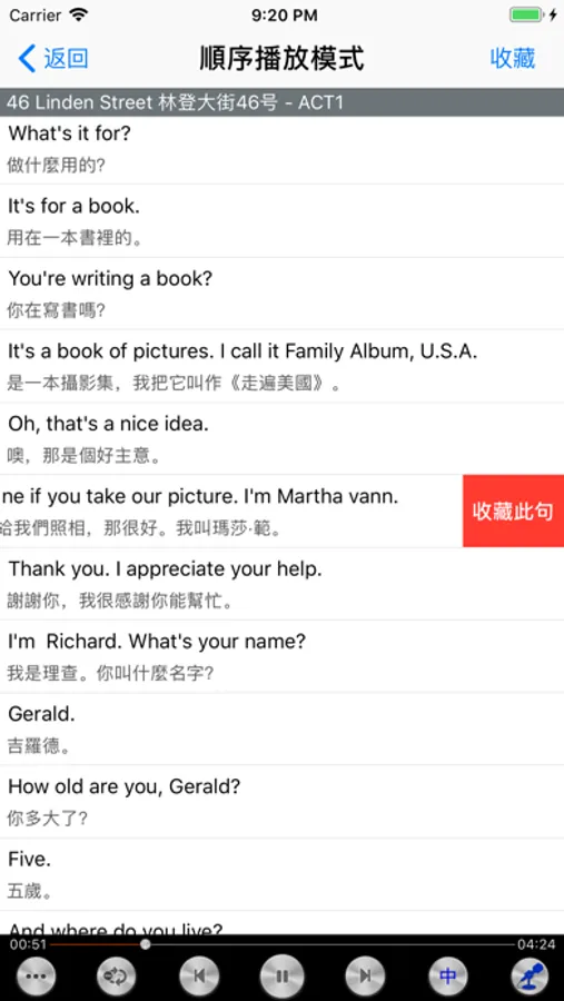 *加入单句收藏功能,播放时手指左右滑动课文即可收藏自己喜欢的句子,学习更加方便