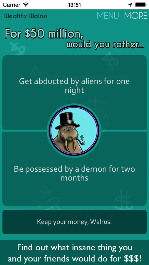 Meet the Wealthy Walrus... a former oil tycoon with a net worth of $11 billion dollars. He'll offer you huge amounts of money to do insane things you'd normally avoid at all costs.