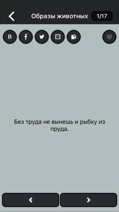 - возможность поделиться пословицами через ВКонтакте, Facebook, Twitter;