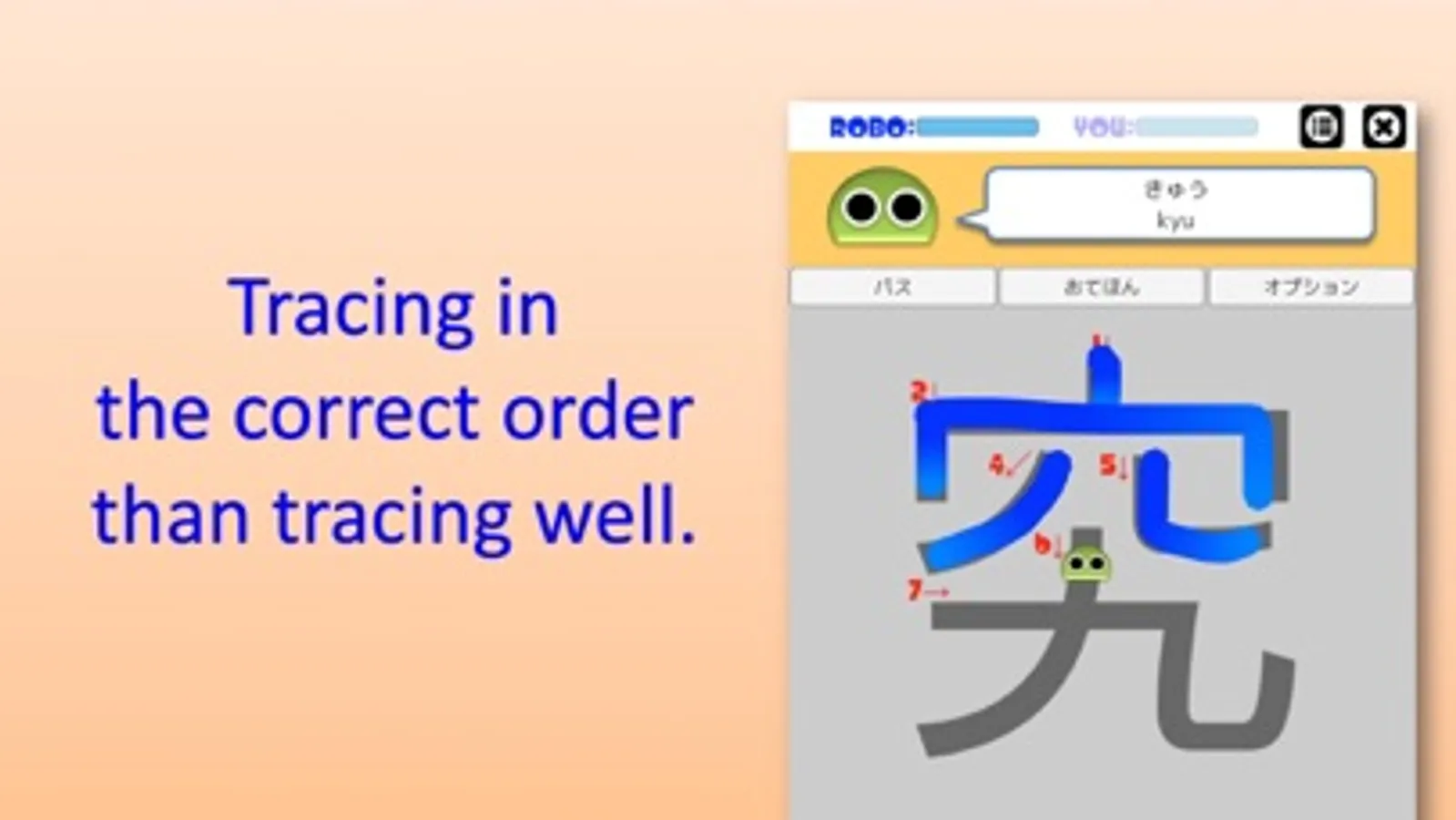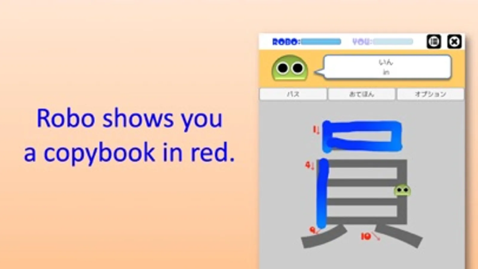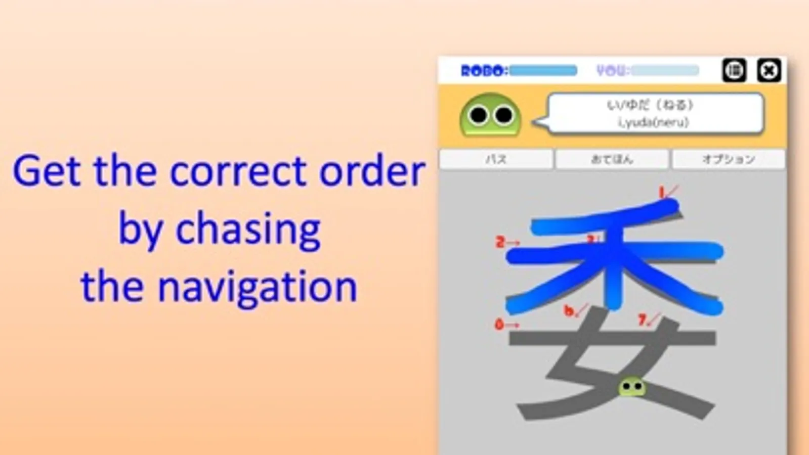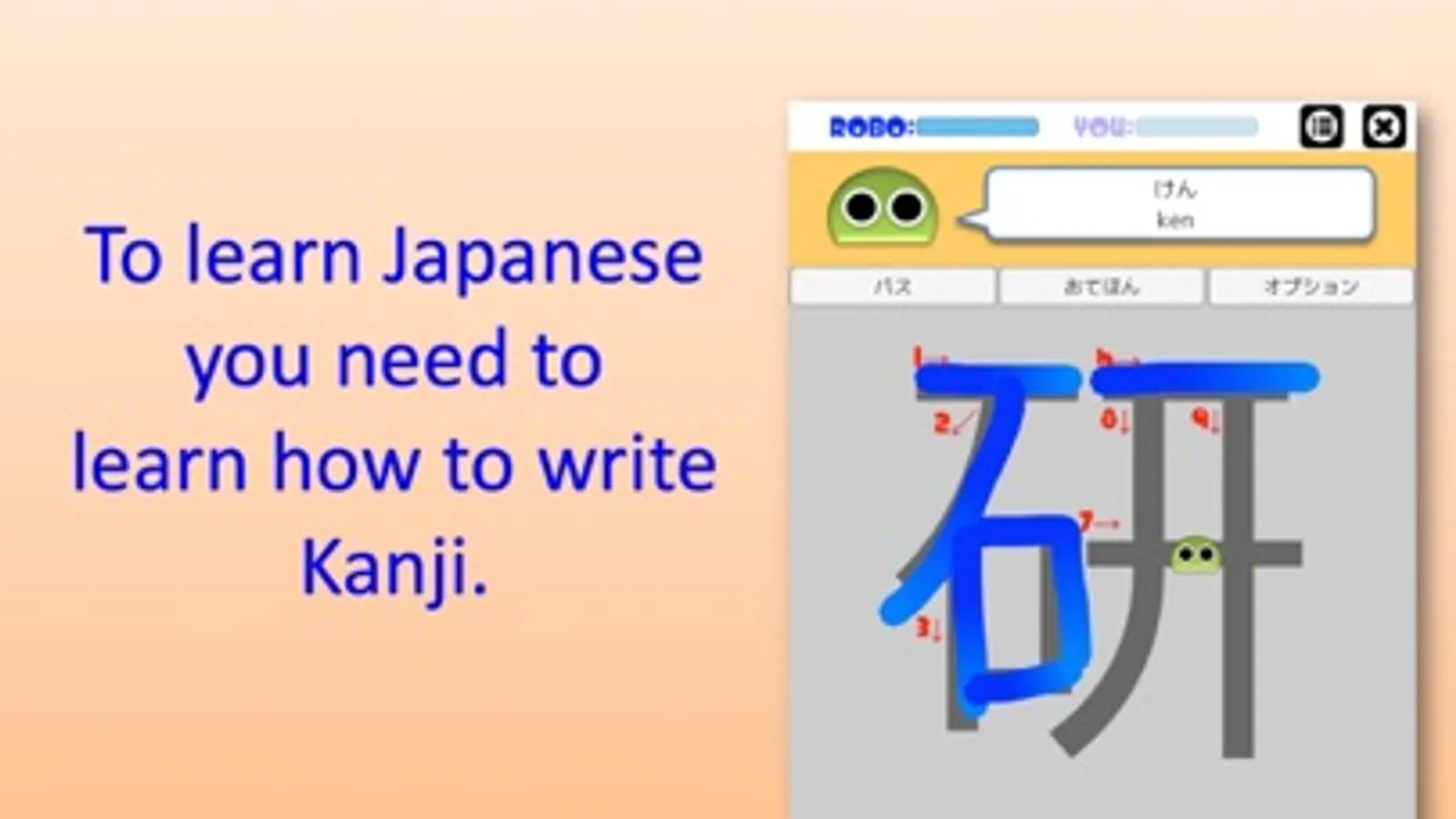 To learn Japanese you need to learn how to write Kanji characters. The best way to learn them is to practice writing them over and over but this can be boring. Instead, have fun and use this game to practice the correct way of writing Kanji - and beat the Robo!