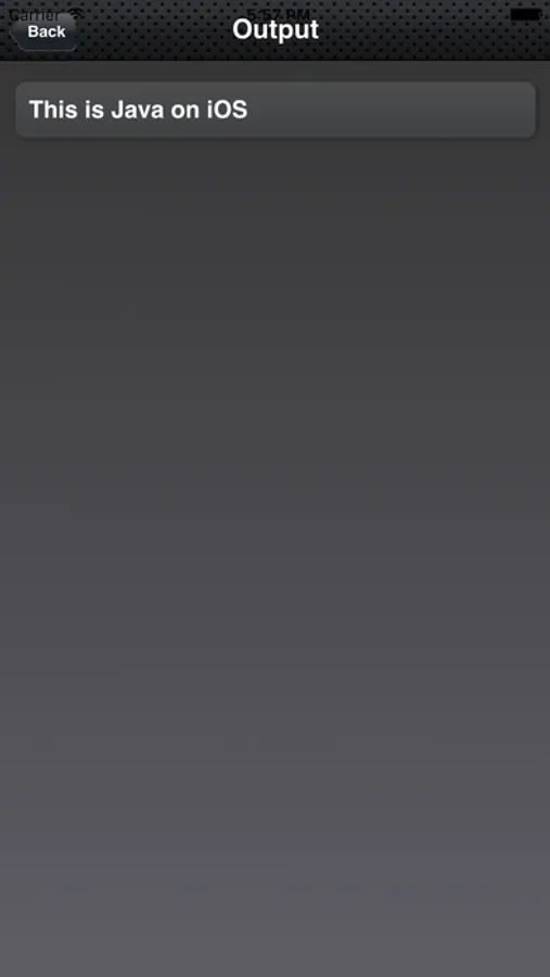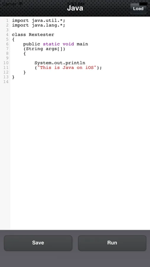 This app lets you type Java code into your iPad or iPhone, and then by pressing "Run" the code is sent off to be compiled and interpreted, and the output is returned to the phone. It is the perfect app to help you learn the Java programming language, when you are away from your computer.