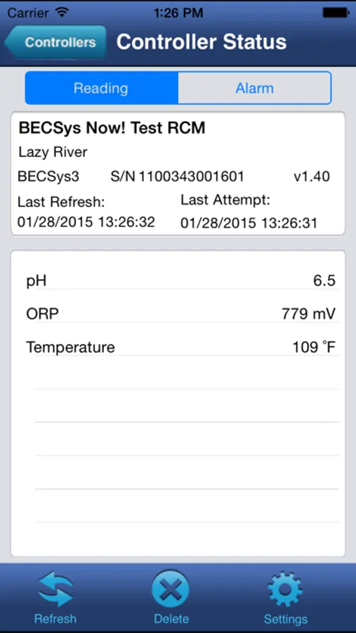 Specific Readings and Alarms can be viewed by selecting a controller from the list.