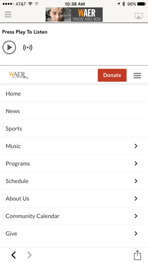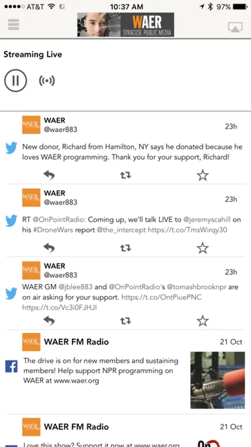 The WAER Syracuse Public Media app allows you to listen to WAER’s three audio streams including the main channel’s news and information stream featuring NPR, PRI and APM programming, 24 hour HD2 jazz channel, and 24 hour HD3 Alternative rock channel. You can also view the program schedule, easily connect to waer.org, and get our social media feeds.