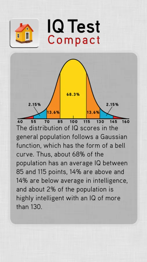 With 45 questions designed to be answered once—and only once— an accurate IQ result is only 30 minutes away with IQ Test Compact.