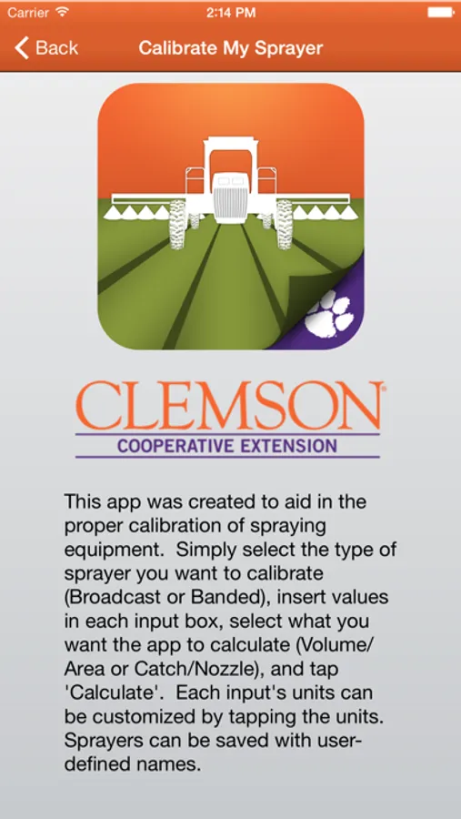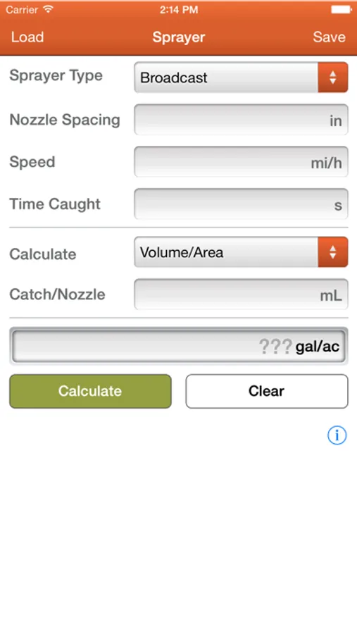 This app was created to aid in the proper calibration of spraying equipment. Simply select the type of sprayer you want to calibrate (Broadcast or Banded), insert values in each input box, select what you want the app to calculate (Volume/Area or Catch/Nozzle), and tap 'Calculate'. Each input's units can be customized by tapping the units. Sprayers can be saved with user-defined names.