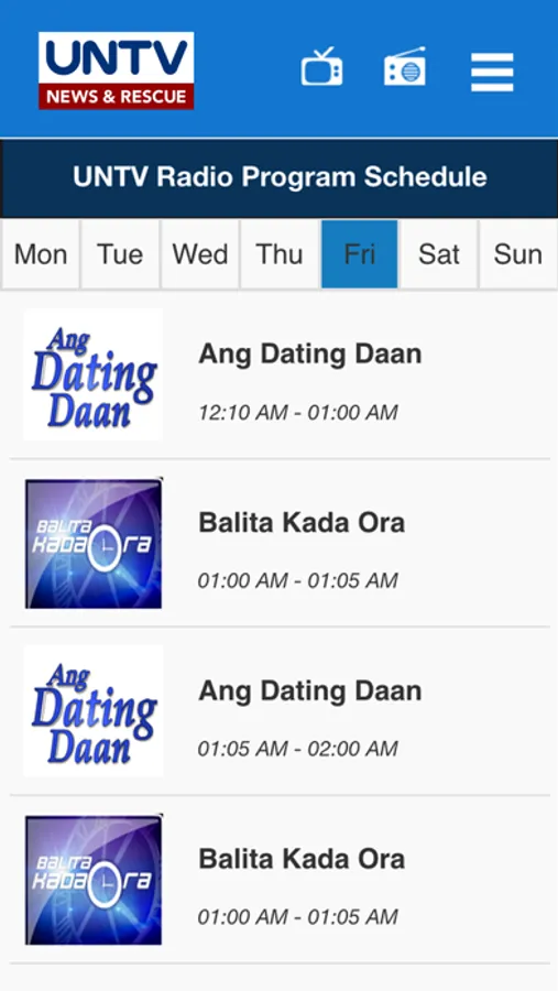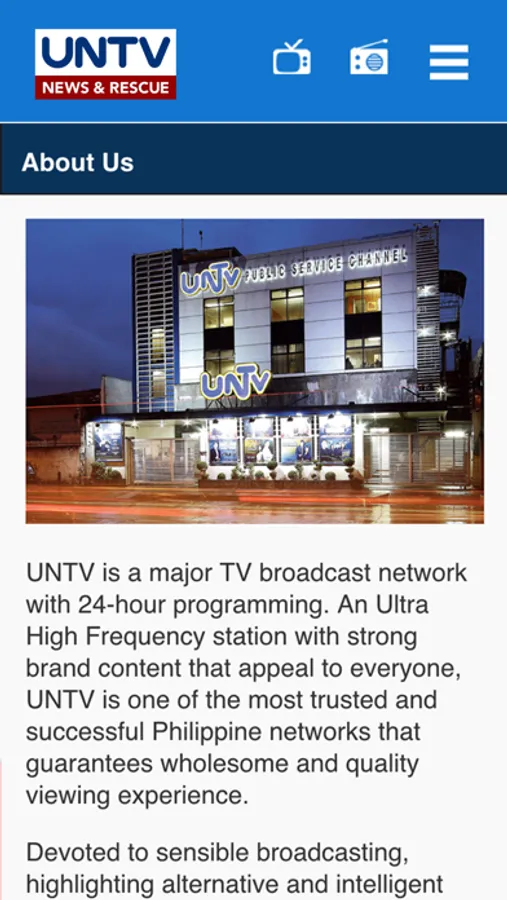 Whether it's watching your favorite public service program on UNTV, or listening to a live on La Verdad Radio, the UNTV app has it all on your mobile device for you. Get live updates from UNTV's Twitter accounts, or hear the latest life-saving effort of the network's News & Rescue Team and more in real time. With the UNTV app, the home of public service in the Philippines is well within your reach.
