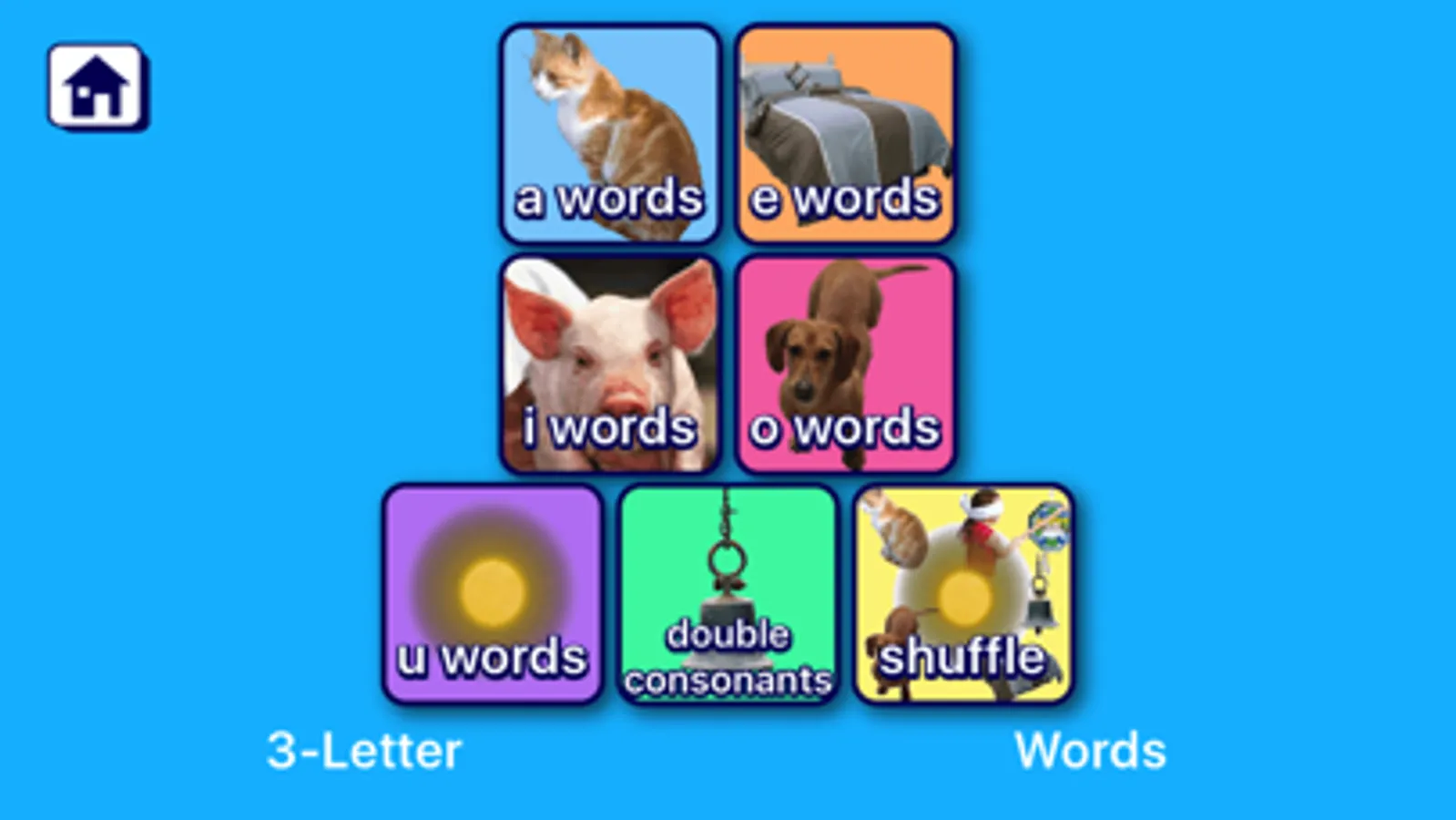 SPELLING MAGIC 1 focuses on CVC (consonant - vowel - consonant) words, such as cat, box and pig. In the first part of the app, the words are categorized by middle vowel sounds. In the second part of the app, the words are sorted by categories rather than by vowel sound.