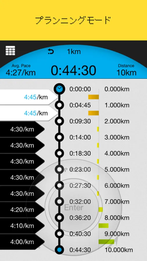 Displays the automatically calculated split times for a fixed distance according to the distance, time and pace you set. Fine tune the pace of each segment with a flick of the dials.