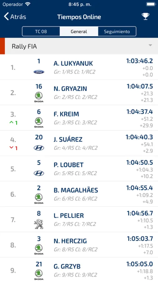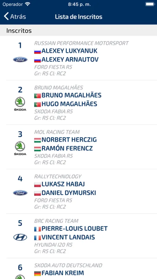 - Lista de inscritos de la prueba.