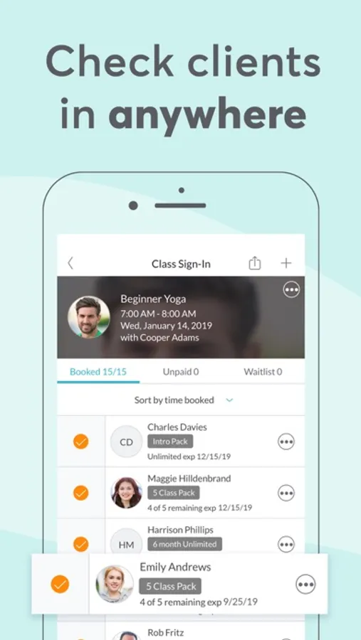 - Eliminate long lines at your front desk by checking clients in.