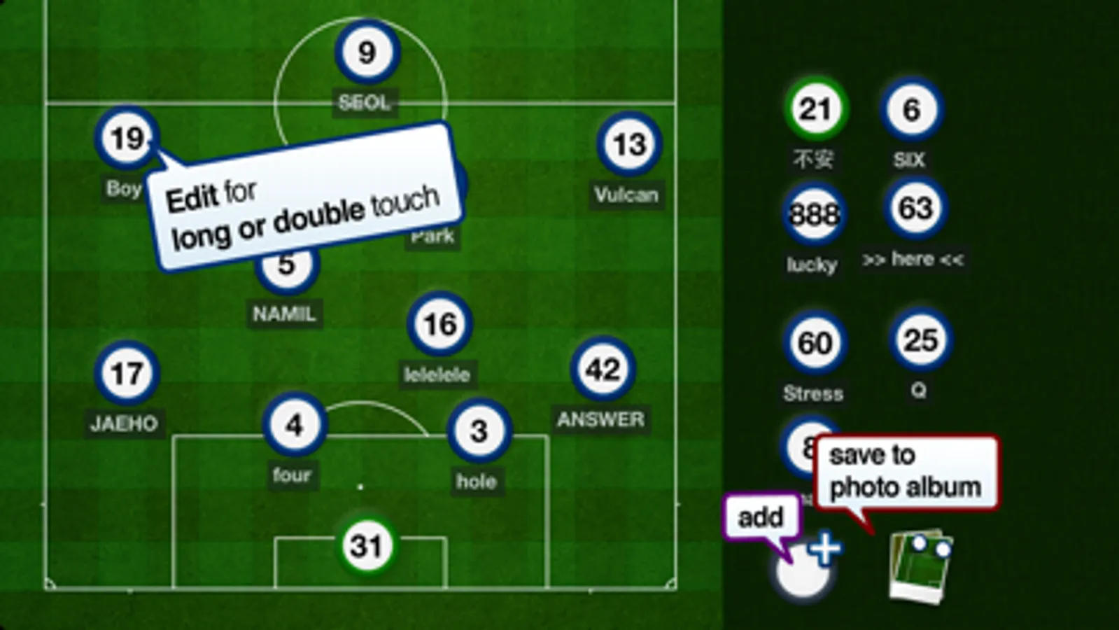 You can name the players, give numbers to the players by long touch or double touch on the players.