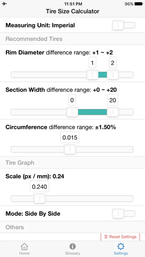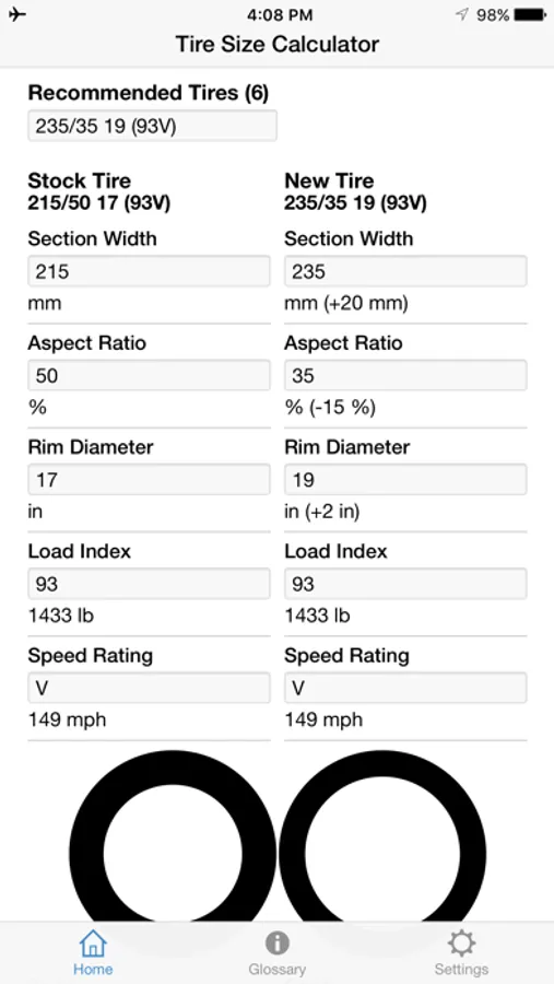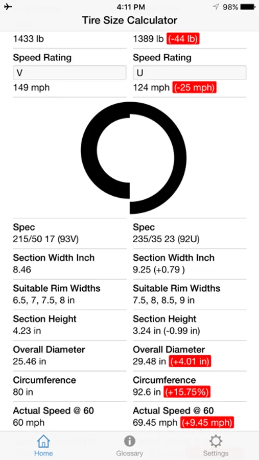 2. Calculate tire sizes, and compare tires with detailed specs, in either Imperial or Metric units. See the visual differences between tires using the scaled tire graph with two display modes: side-by-side as two complete tire circles, or use half of each tire to constitute one tire circle.